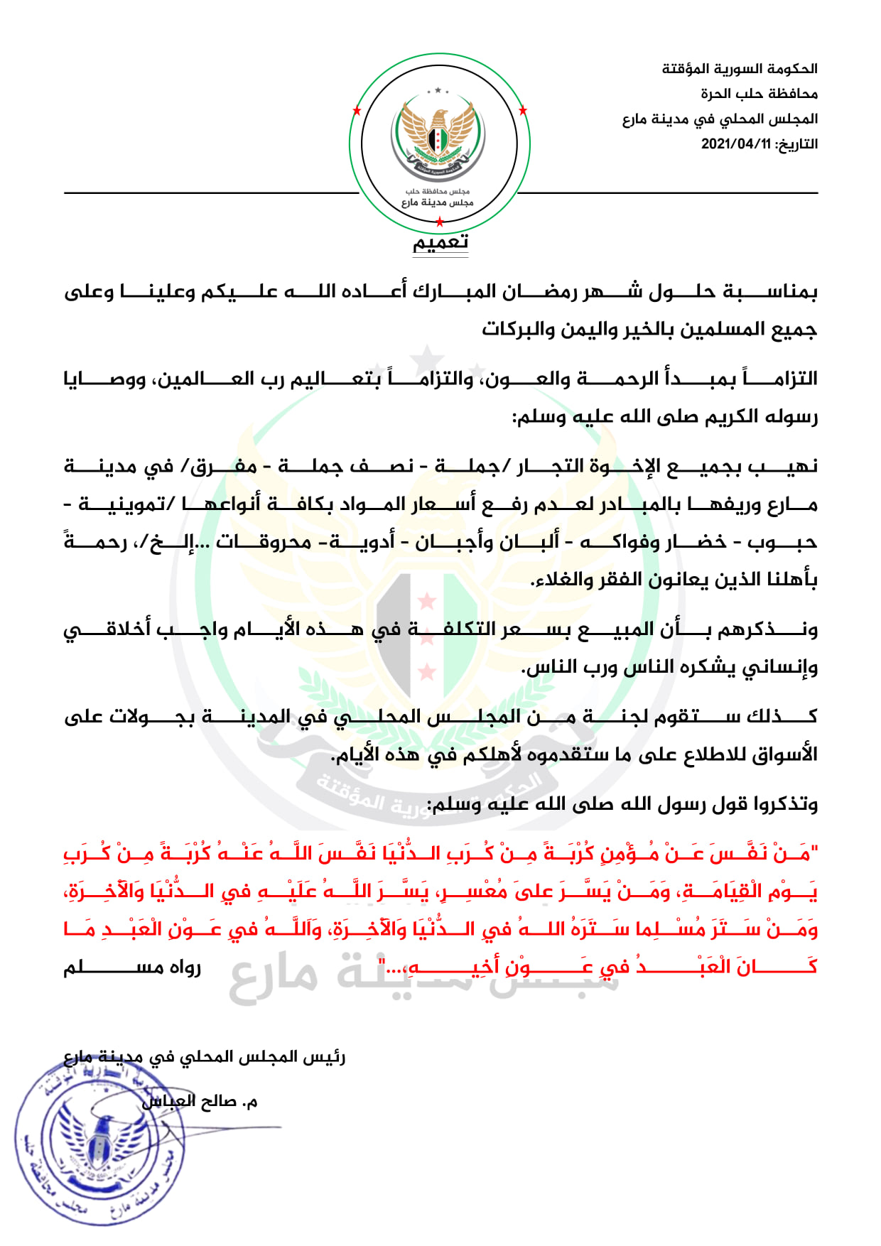 تعميم من المجلس المحلي في مدينة مارع إلى التجار بالمبادر لعدم رفع أسعار المواد بكافة أنواعه في شهر رمضان