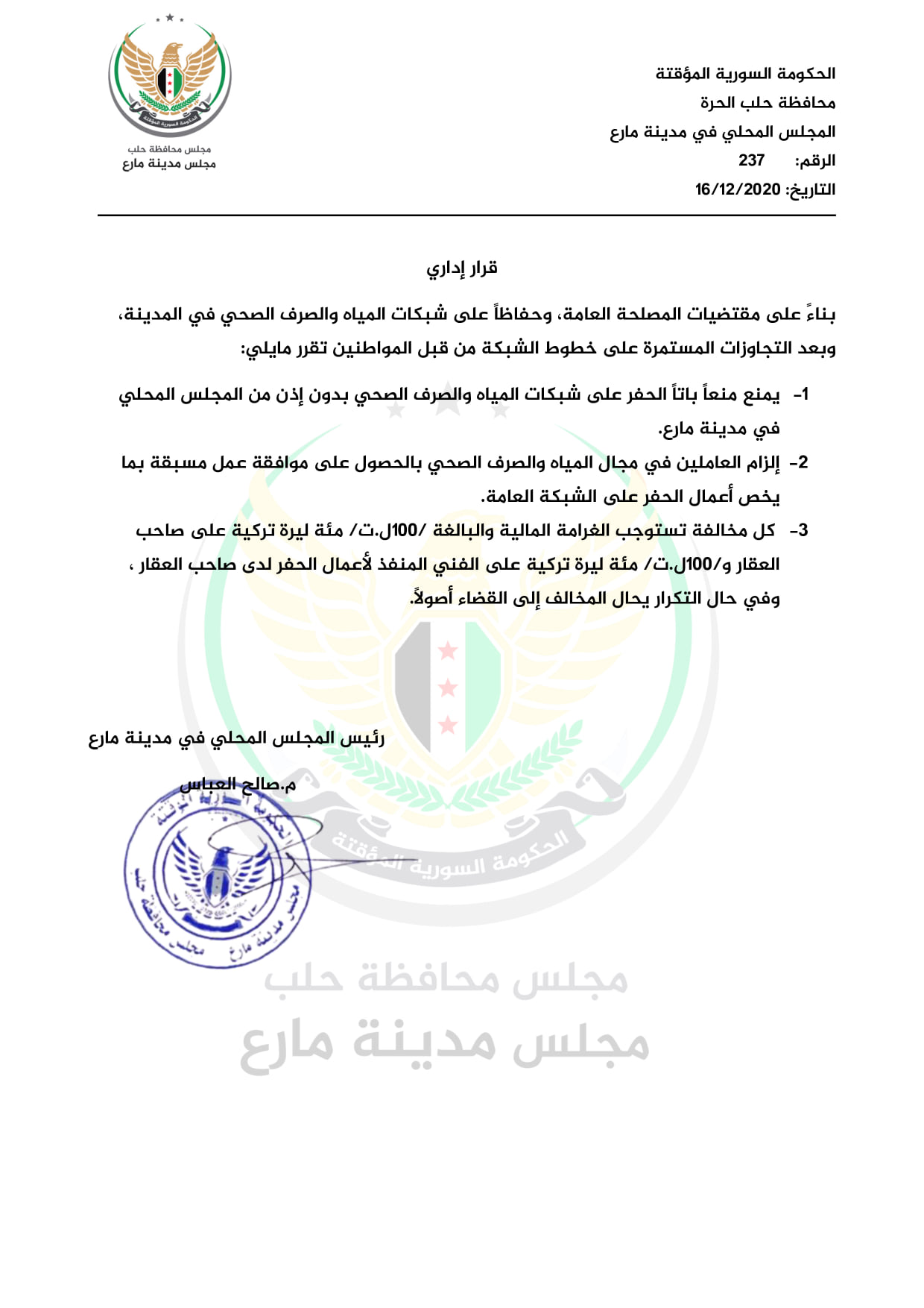 تعميم من المجلس المحلي في مدينة مارع الحفر على شبكات المياه والصرف الصحي بدون إذن من المجلس المحلي في مدينة مارع