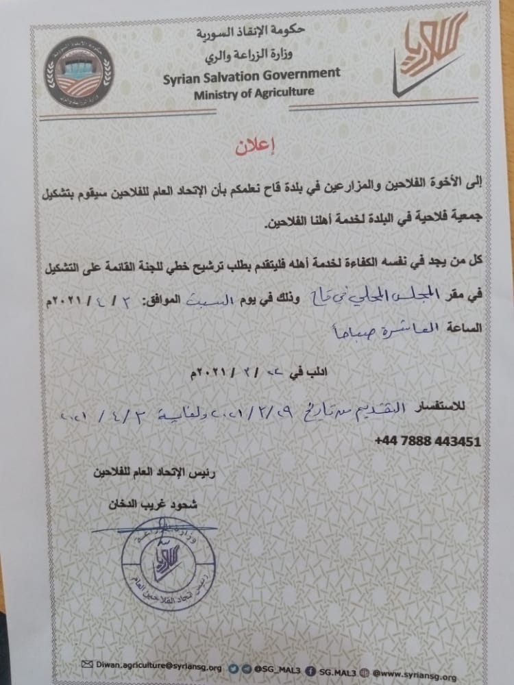 إعلان من الاتحاد العام للفلاحين حول تشكيل جمعية فلاحية في بلدة قاح