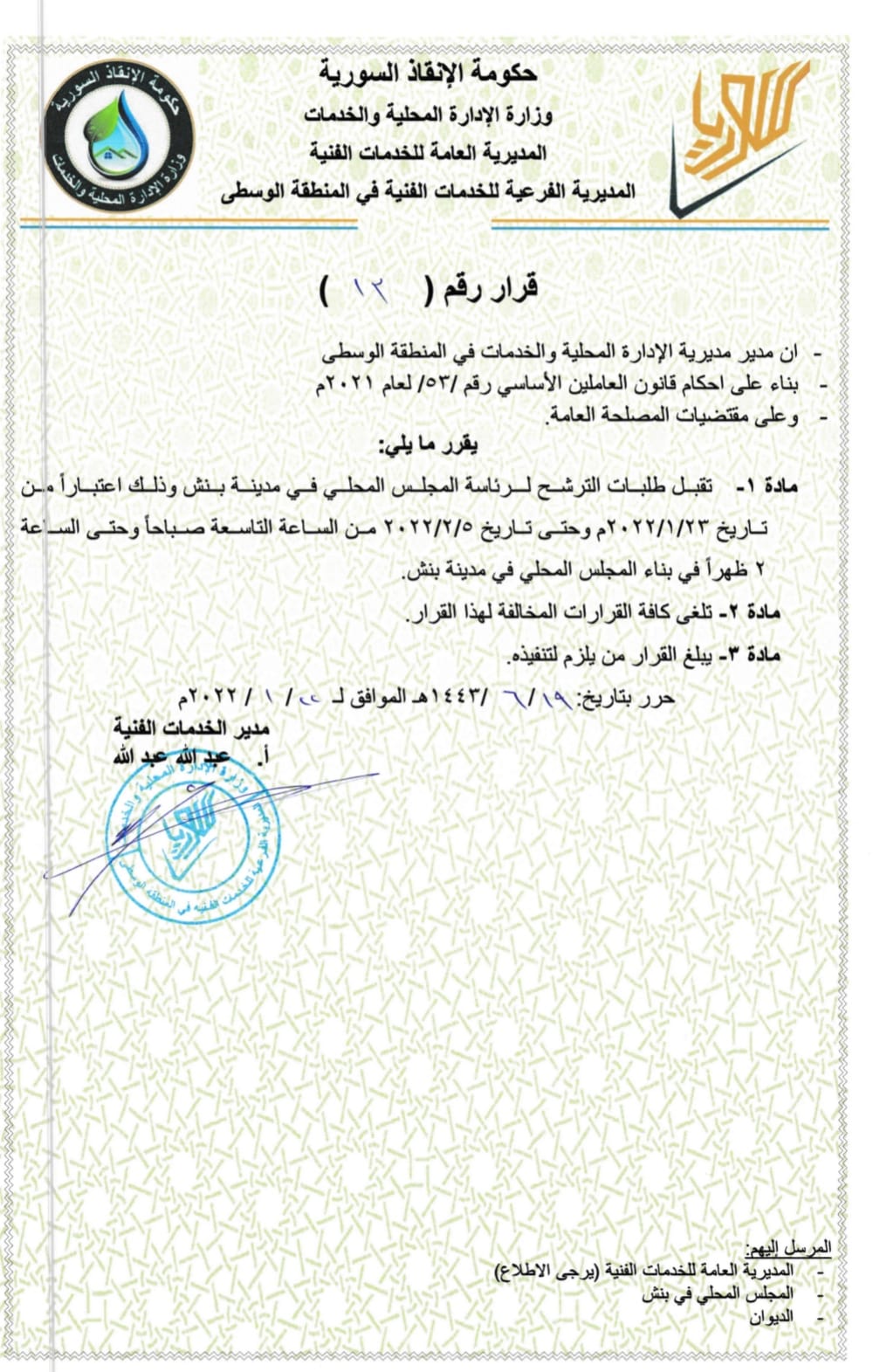 تعميم من مديرية الخدمات الفنية بشأن بدء قبول طلبات الترشح لانتخابات رئاسة المجلس المحلي في بنش