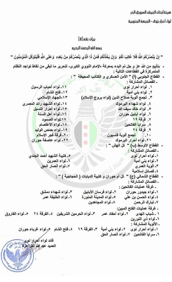 إعلان إطلاق معركة الإمام النووي الكبرى من قبل لواء أحرار نوى