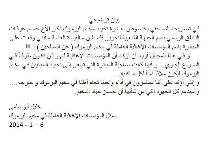 بيان من المؤسسات الإغاثية العاملة في مخيم اليرموك تؤكد فيه عدم كونها طرفاً في الصراع الجاري وأنها صاحبة المبادرة في تحييد المدنيين