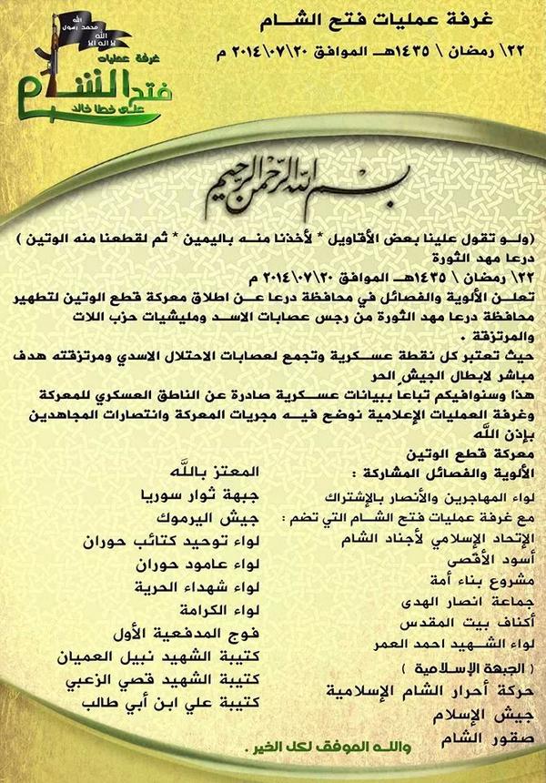 إعلان إطلاق معركة قطع الوتين من قبل غرفة عمليات فتح الشام في محافظة درعا