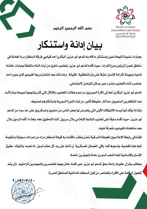 فإننا في رابطة الإعلاميين للغوطة الشرقية نثمّن ونقدّر ماقامت به قيادة السلطان مراد من إجراءات مسؤولة وحكيمة