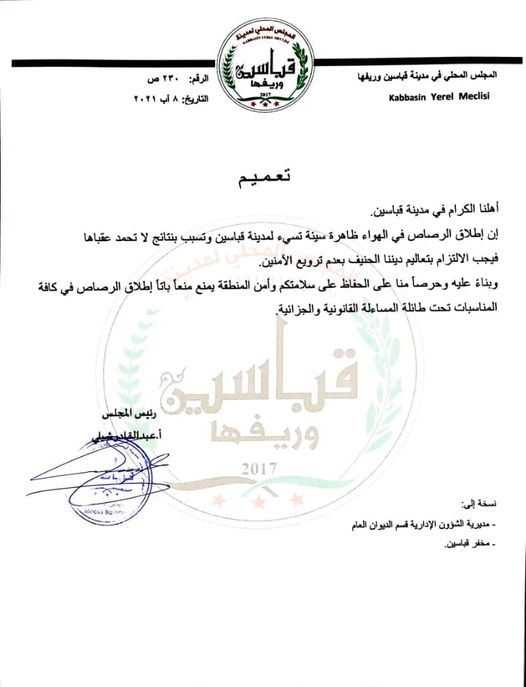 Kabbasin Yerel Meclisi olarak düğünlerde ateşli silah kullanımının yasak olduğunu ilan ederiz. Buna uymayanlar hakkında hukuki işlem başlatılacaktır.