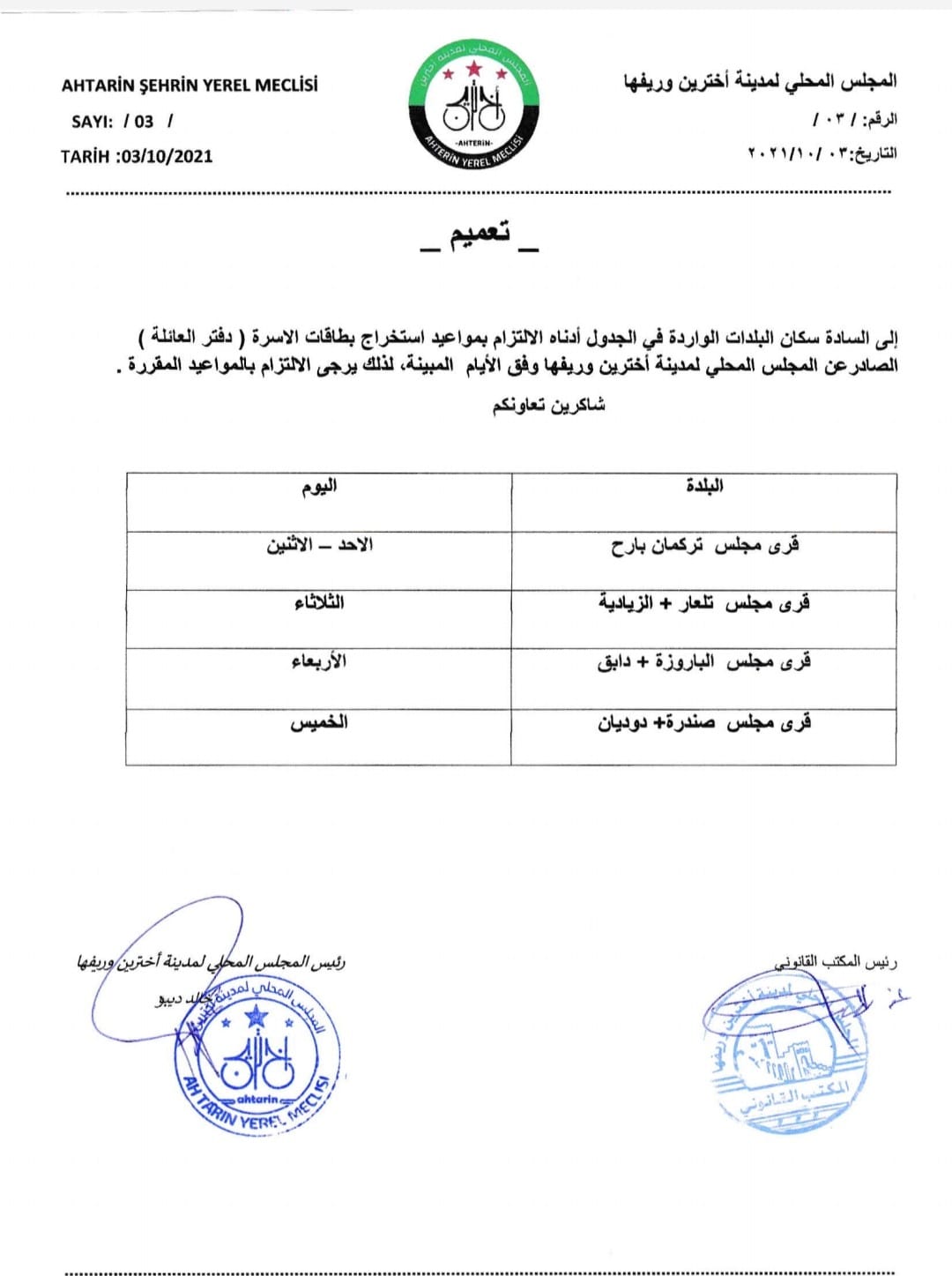 تعميم من المجلس المحلي لمدينة اخترين وريفها بشأن تحديد مواعيد استخراج بطاقة الأسرة