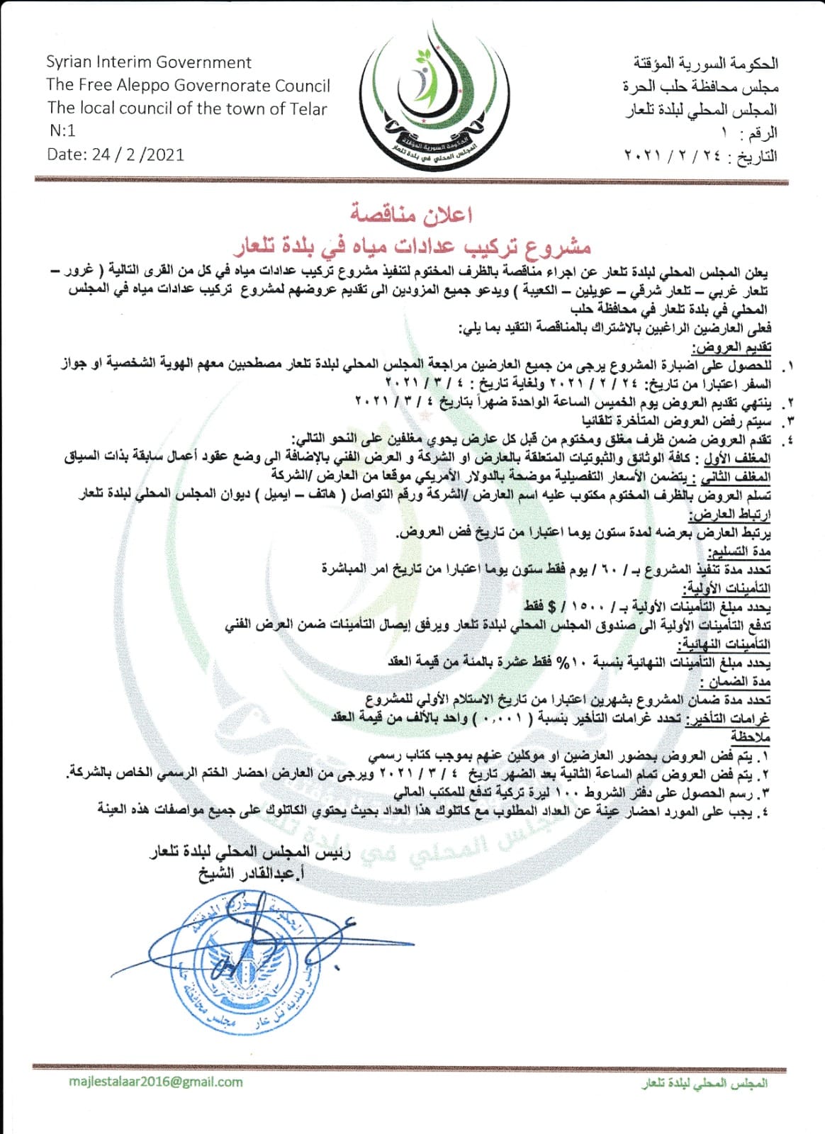 بيان من المجلس المحلي لبلدة تلعار يعلن فيه عن إجراء مناقصة لتنفيذ مشروع تركيب عدادات مياه