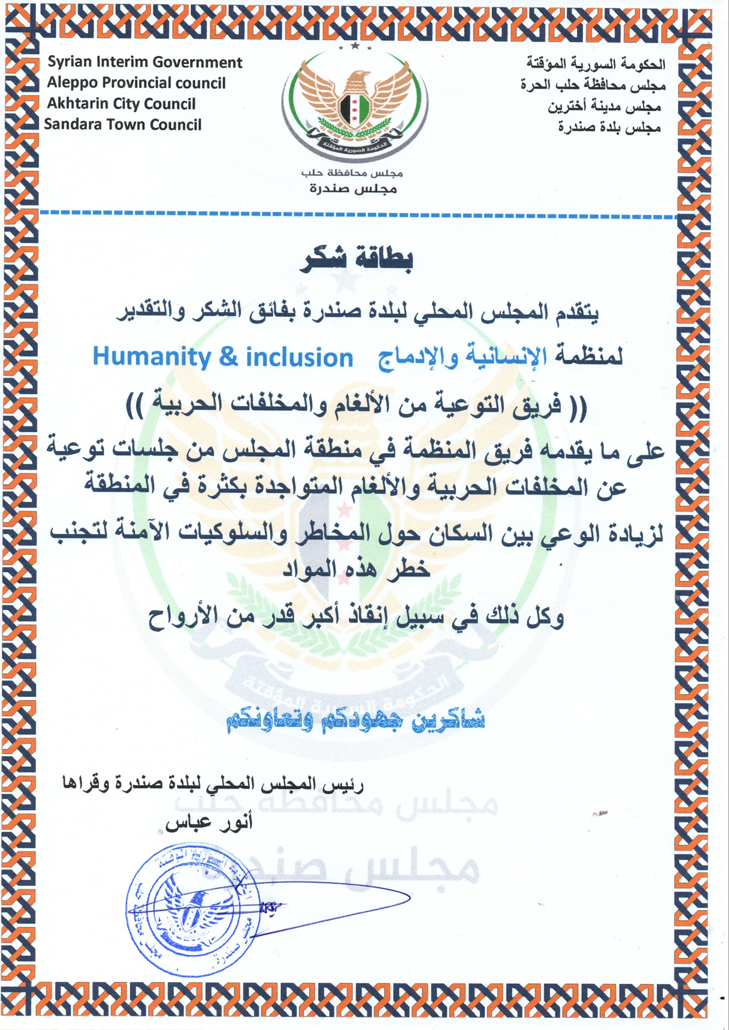 بيان من المجلس المحلي لبلدة صندرة يشكر فيه منظمة الإنسانية والإدماج فريق التوعية من الالغام والمخلفات الحربية على مايقدمه من جلسات توعية من المخلفات الحربية والألغام