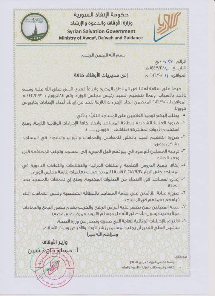 تعميم من وزارة الأوقاف في حكومة الإنقاذ إلى مديريات الأوقاف كافة بتشديد العناية بنظافة المساجد ومنع استخدام المناشف والكؤوس المشتركة