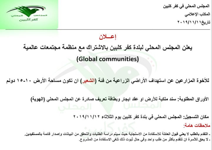 بيان من المجلس المحلي في بلدة كفر كلبين بشأن إعلانه وبالتعاون مع منظمة مجتمعات عالمية عن مشروع زراعي لدعم زراعة الشعير