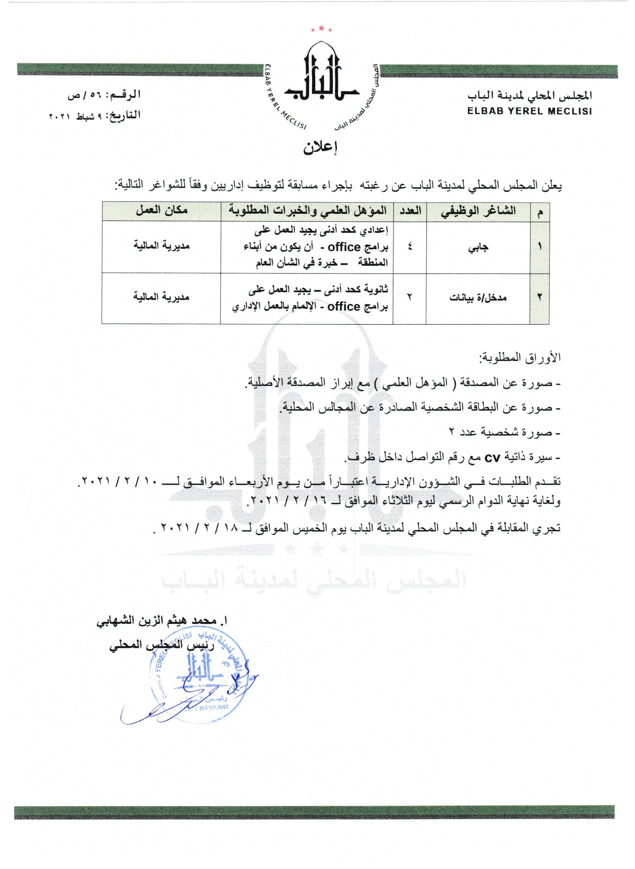 بيان من المجلس المحلي لمدينة البابيعلن فيه عن رغبته بإجراء مسابقة لتوظيف إداريين في مديرية المالية