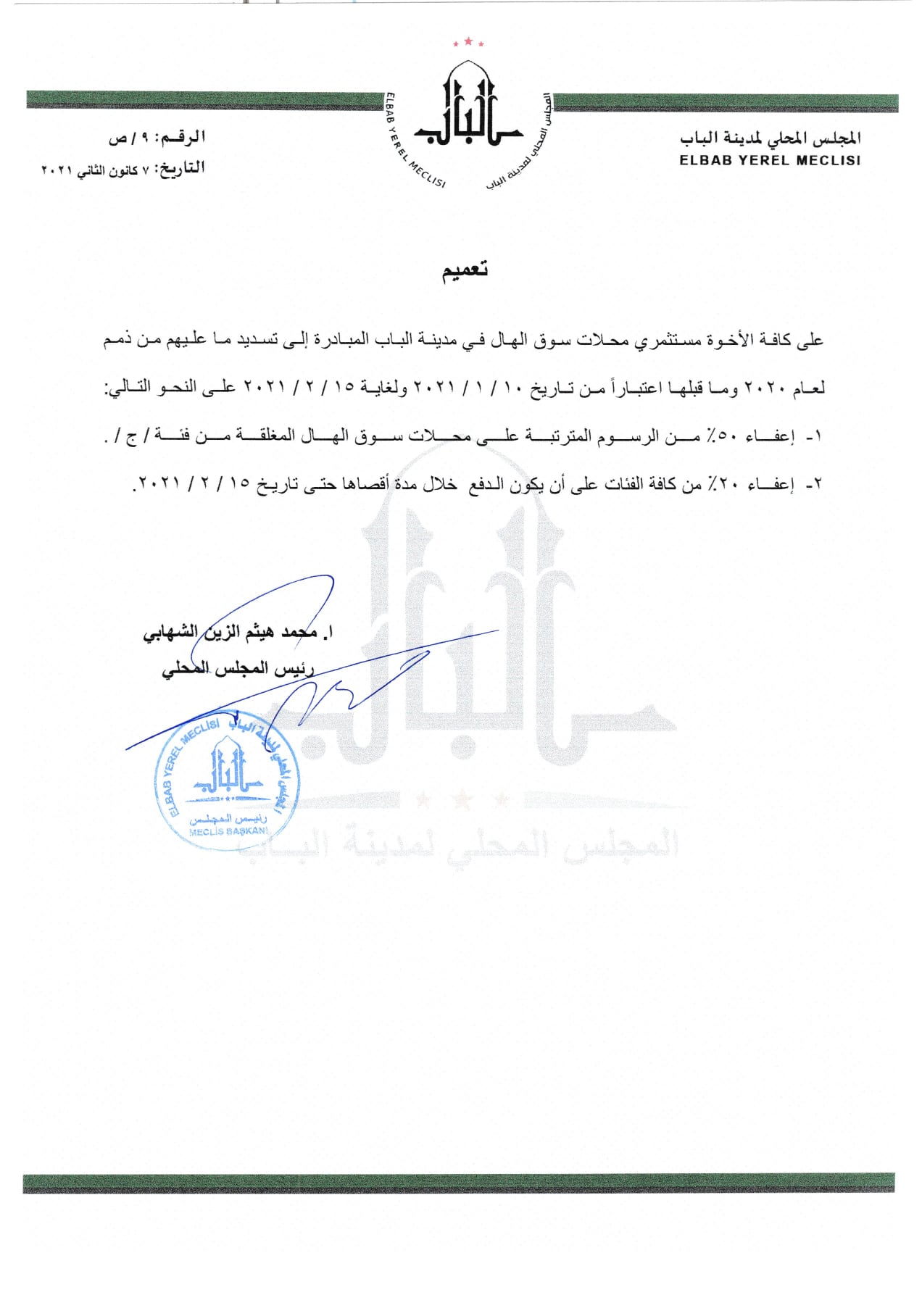 تعميم من المجلس المحلي لمدينة الباب إلى مستثمري محلات سوق الهال لتسديد ما عليهم
