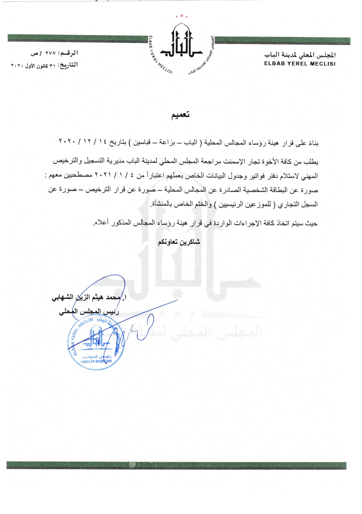 تعميم من المجلس المحلي لمدينة الباب إلى كافة تجار الإسمنت لمراجعة مديرية التسجيل والترخيص المهني