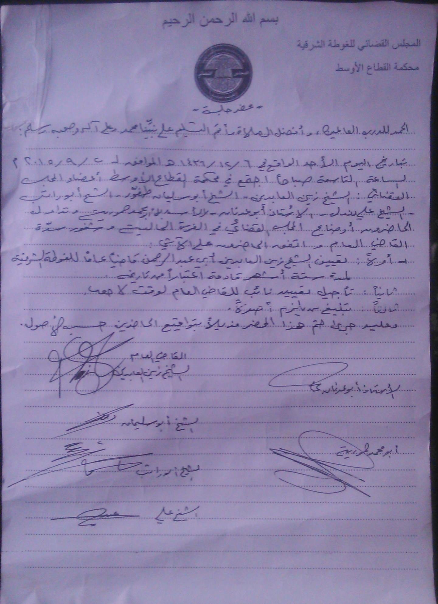 أولاً: تعين الشيخ زين العابدين أبي عبد الرحمن قاضياً عاماً للغوطة الشرقية لمدة ستة أشهر قادمة اعتباراً من تاريخه.