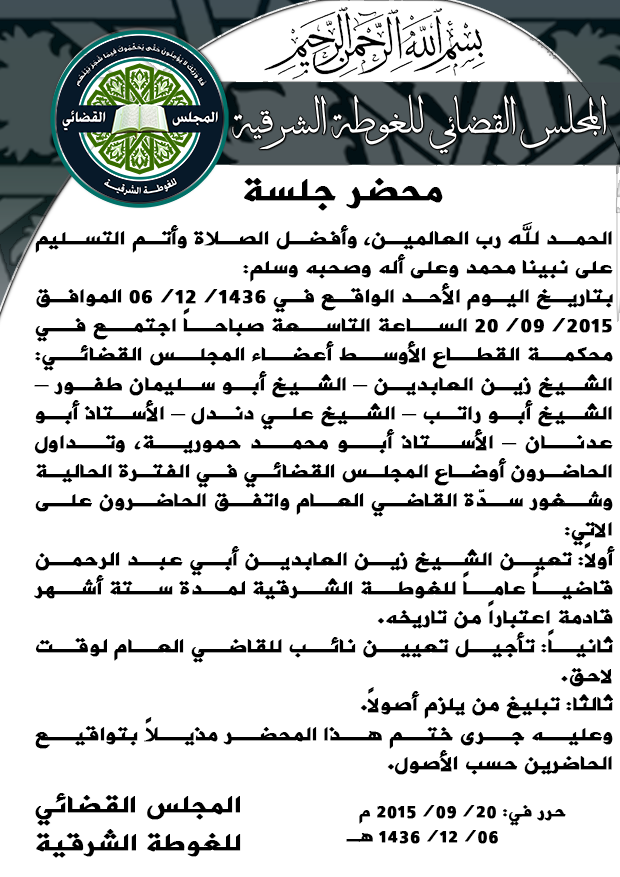 بيان المجلس القضائي للغوطة الشرقية حول القرارات التي تم اتخاذها في اجتماعه 20/09/2015