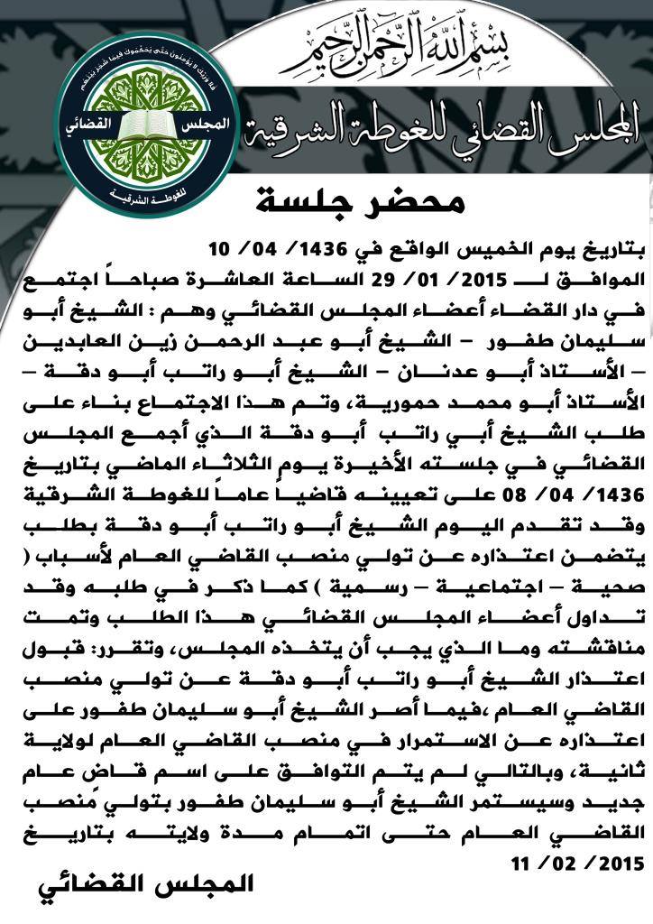 بتاريخ يوم الخميس الواقع في 10/04/1436 الموافق لـ 29/01/2015 الساعة العاشرة صباحاً اجتمع في دار القضاء أعضاء المجلس القضائي وهم : الشيخ أبو سليمان طفور - الشيخ أبو عبد الرحمن زين العابدين – الأستاذ أبو عدنان - الشيخ أبو راتب أبو دقة – الأستاذ أبو محمد حمورية، وتم هذا الاجتماع بناء على طلب الشيخ أبي راتب أبو دقة الذي أجمع المجلس القضائي في جلسته الأخيرة يوم الثلاثاء الماضي بتاريخ 08/04/1436 على تعيينه قاضياً عاماً للغوطة الشرقية وقد تقدم اليوم الشيخ أبو راتب أبو دقة بطلب يتضمن اعتذاره عن تولي منصب القاضي العام لأسباب ( صحية – اجتماعية – رسمية ) كما ذكر في طلبه وقد تداول أعضاء المجلس القضائي هذا الطلب وتمت مناقشته وما الذي يجب أن يتخذه المجلس، وتقرر: قبول اعتذار الشيخ أبو راتب أبو دقة عن تولي منصب القاضي العام ،فيما أصر الشيخ أبو سليمان طفور على اعتذاره عن الاستمرار في منصب القاضي العام لولاية ثانية، وبالتالي لم يتم التوافق على اسم قاضٍ عام جديد وسيستمر الشيخ أبو سليمان طفور بتولي منصب القاضي العام حتى اتمام مدة ولايته بتاريخ 11/02/2015