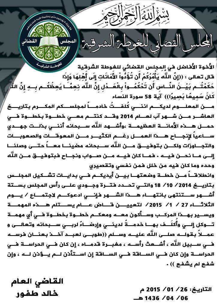 بيان من لقاضي العام خالد طفور يدعو فيه المجلس القضائي للإجتماع لاختيار قاض جديد للغوطة نظراً لانتهاء ولايته