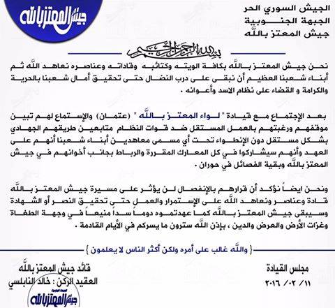 بيان من جيش المعتز بالله حول انفصال لواء المعتز بالله عنه