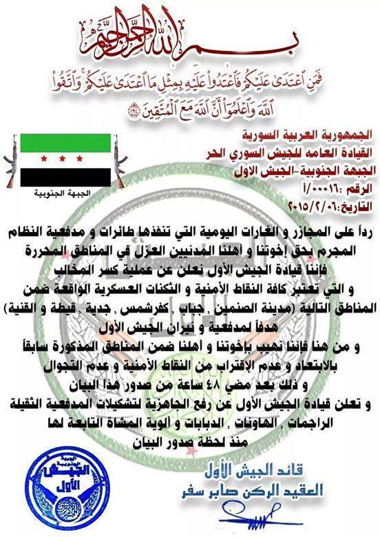 بيان من الجيش الأول يعلن فيه عن بدء عملية كسر المخالب والتي تهدف لاستهداف المراكز الأمنية والمواقع العسكرية في مدينة الصنمين وجباب وكفر شمس وجدية وقيطة والقنية