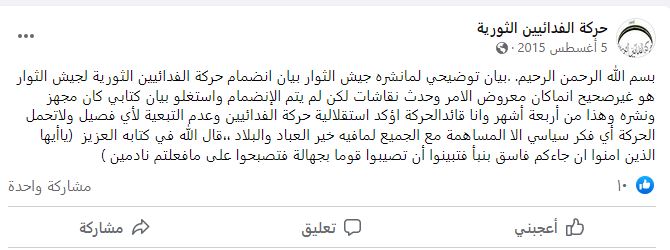 بيان نفي من حركة الفدائيين الثورية حول اندماجها في جيش الثوار