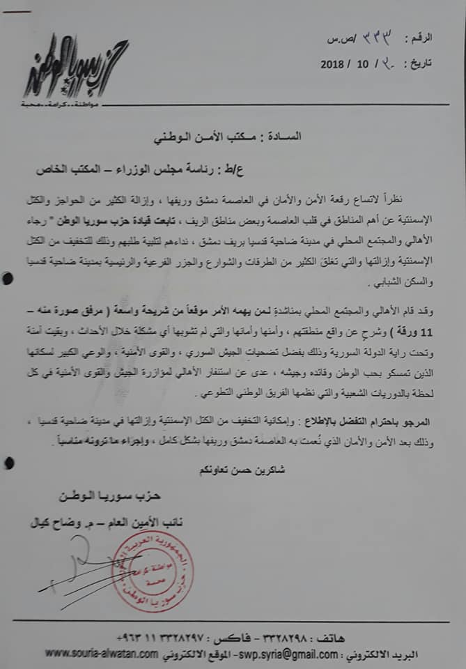 بيان من حزب سوريا الوطن بشأن مناشدته مكتب الأمن الوطني بتخفيف الجواجز والكتل الإسمنتية في الطرقات بناء على طلب أهالي المناطق