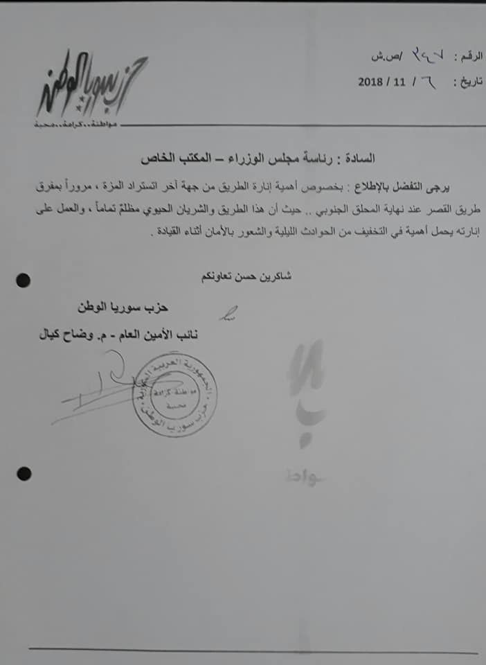 بيان من حزب سوريا الوطن بشأن مناشدته مكتب رئاسة الوزراء بشأن استكمال انارة أتستراد المزة