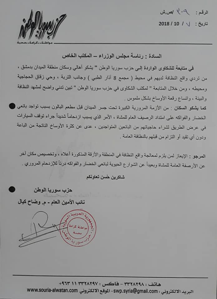 بيان من حزب سوريا الوطن بشأن مناشدته مكتب رئاسة الوزراء الإستجابة لطلب أهالي الميدان حول تردي واع النظافة في بعض الأماكن