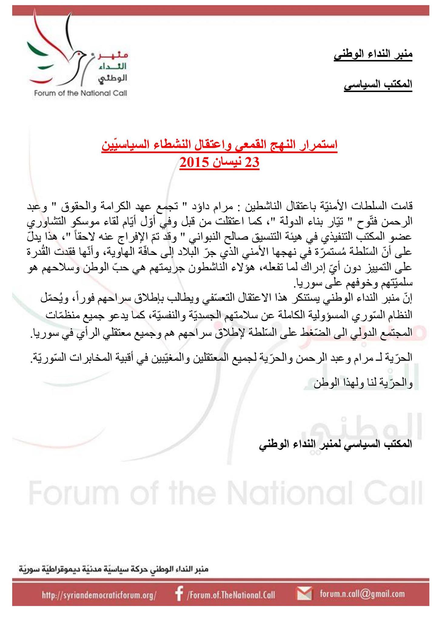 إنّ منبر النداء الوطني يستنكر هذا الاعتقال التعسّفي ويطالب بإطلاق سراحهم فوراً، ويُحمّل النظام السّوري المسؤولية الكاملة عن سلامتهم الجسديّة والنفسيّة، كما يدعو جميع منظمّات المجتمع الدولي الى الضّغط على السّلطة لإطلاق سراحهم هم وجميع معتقلي الرأي في سوريا.
