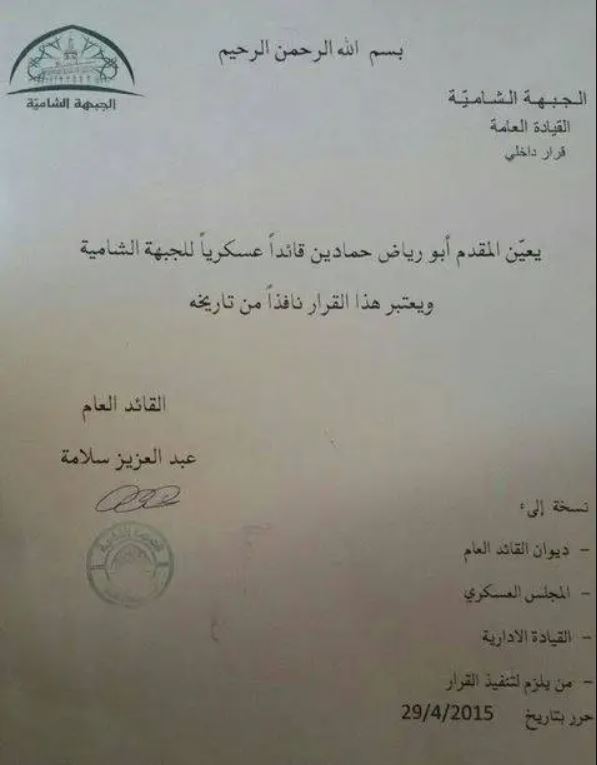 قرار تعيين المقدم محمد الحمادين قائداً عسكرياً للجبهة الشامة