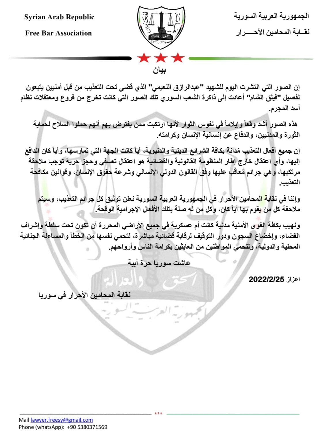بيان من نقابة المحامين الأحرار في سوريا حول جريمة مقتل عبدالرازق النعيمي الذي قضى تحت التعذيب من قبل أمنيين يتبعون لفصيل "فيلق الشام