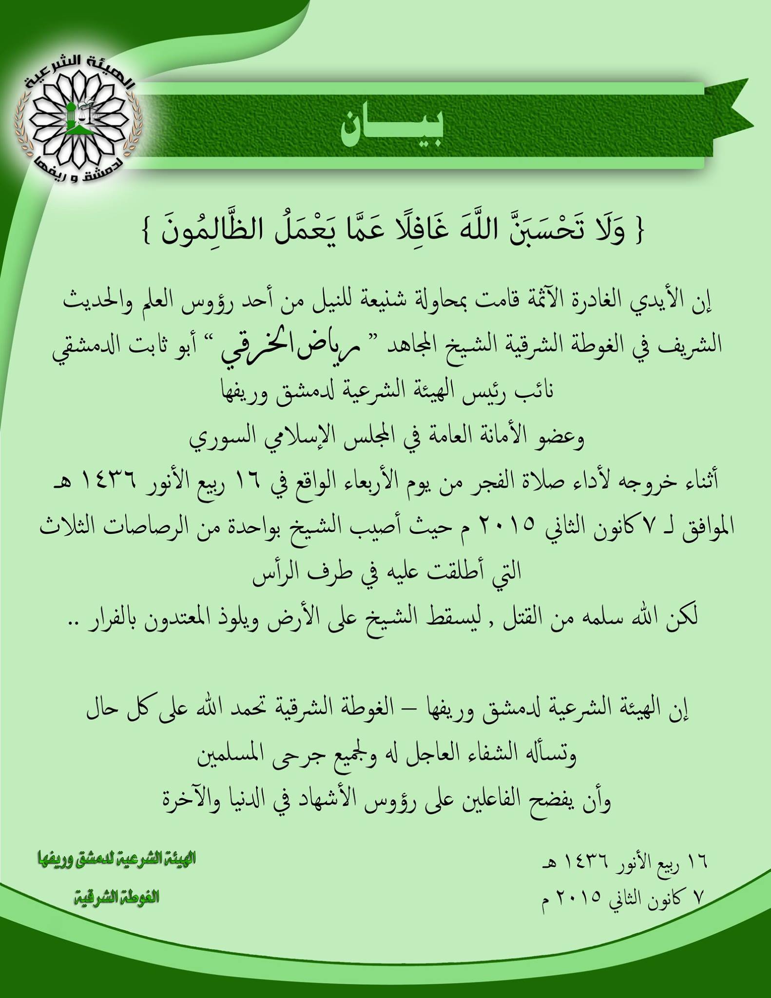 بيان من الهيئة الشرعية لدمشق وريفها حول حادثة محاولة اغتيال الشيخ رياض الخرقي نائب رئيس الهيئة الشرعية لدمشق وريفه