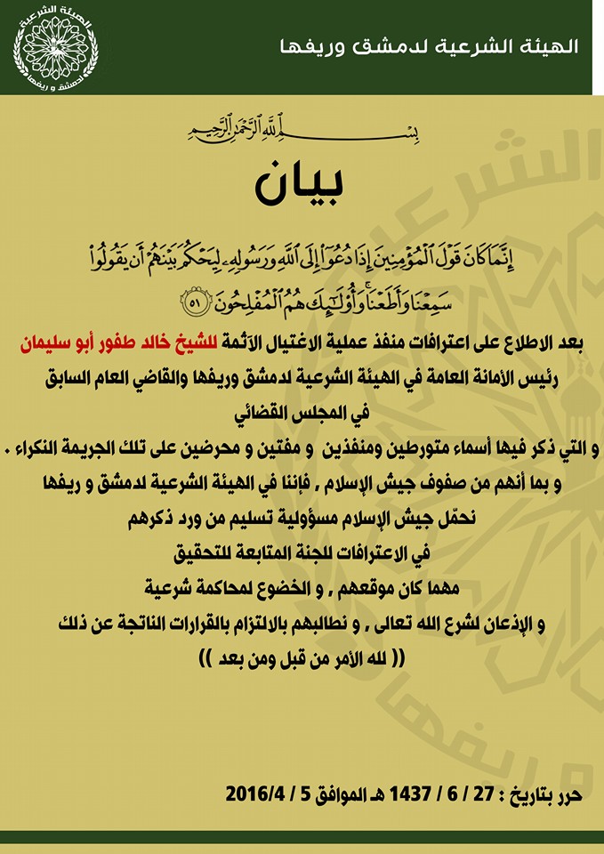 بيان من الهيئة الشرعية في دمشق وريفها تحمل فيه جيش الإسلام مسؤولية تسليم من ذكرهم في قضية محاولة اغتيال الشيخ خالد طفور