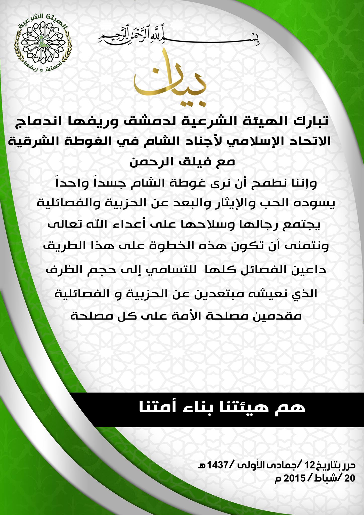 بيان من الهيئة الشرعية في دمشق وريفها تبارك فيه اندماج الاتحاد الإسلامي لأجناد الشام مع فيلق الرحمن في الغوطة الشرقية