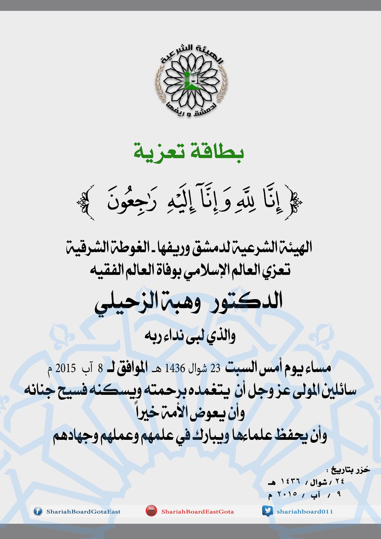 بيان من الهيئة الشرعية في دمشق وريفها تعزي فيه بوفاة الشيخ العالم وهبة الزحيلي