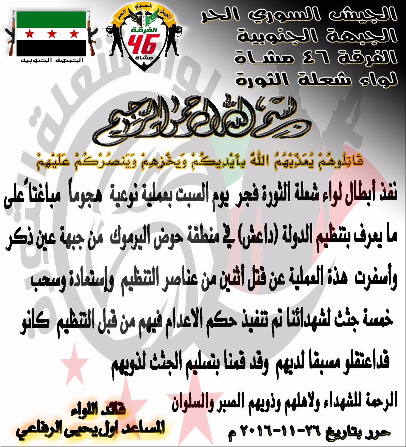 بيان من لواء شعلة الثورة بشأن تنفيذه عملية نوعية ضد تنظيم الدولة في حوض اليرموك