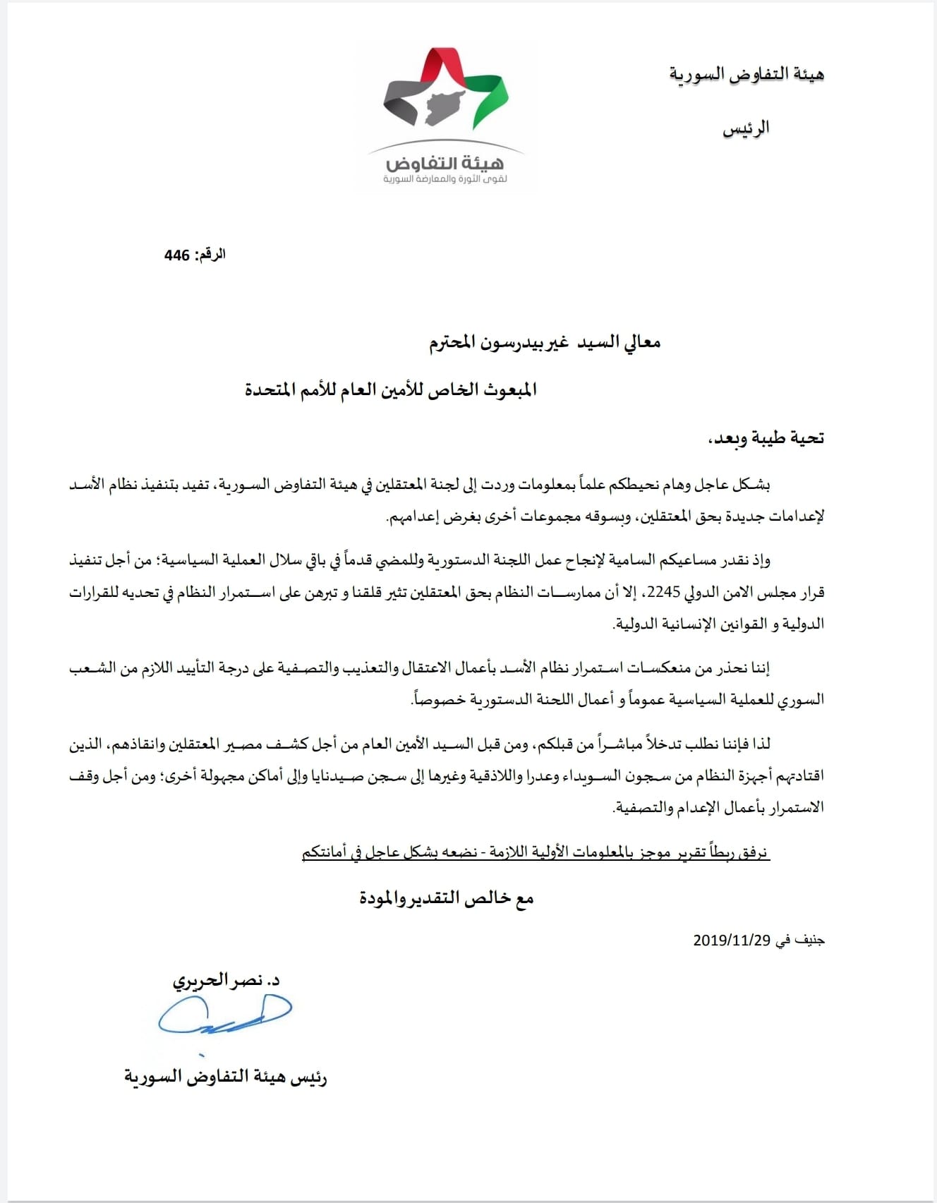 كتاب هيئة التفاوض السورية إلى المبعوث الدولي حول جرائم الحرب داخل سجون النظام السوري