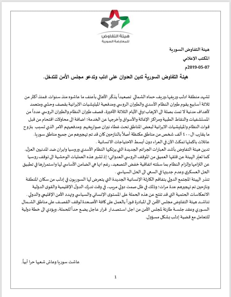 هيئة التفاوض السورية تدين العدوان على إدلب وتدعو مجلس الأمن للتدخل