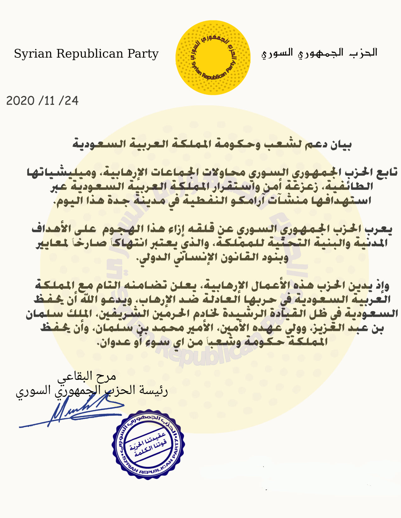 بيان إدانة من الحزب الجمهوري السوري للهجمات الإرهابية التي تعرضت لها السعودية