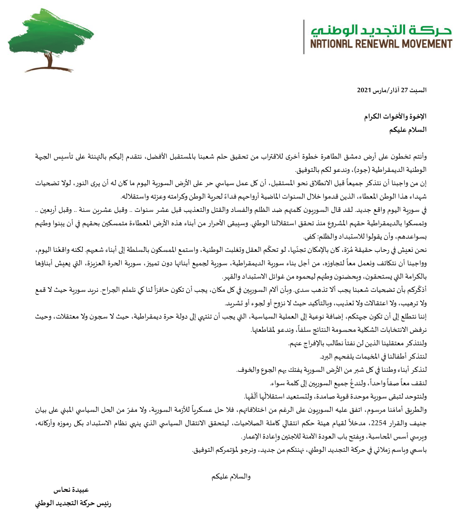 بيان من حركة التجديد الوطني يدين فيه منع الأمن السوري عقد اجتماع تأسيس الجبهة الوطنية الديمقراطية جود في دمشق