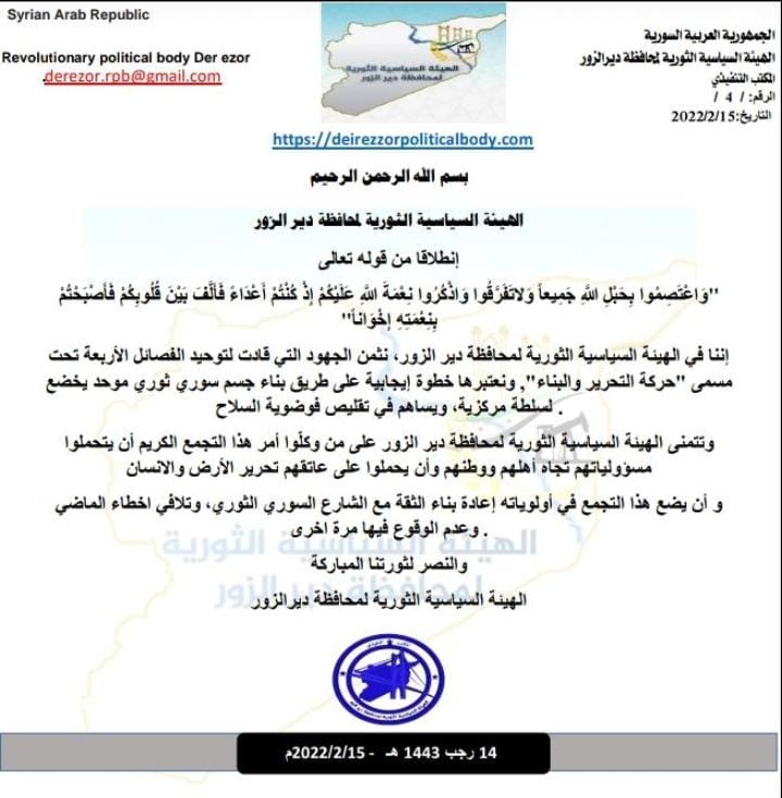 إننا في الهيئة السياسية الثورية لمحافظة دير الزور، نثمن الجهود التي قادت لتوحيد الفصائل الأربعة تحت مسمى "حركة التحرير والبناء", ونعتبرها خطوة إيجابية على طريق بناء جسم سوري ثوري موحد يخضع لسلطة مركزية، ويساهم في تقليص فوضوية السلاح .