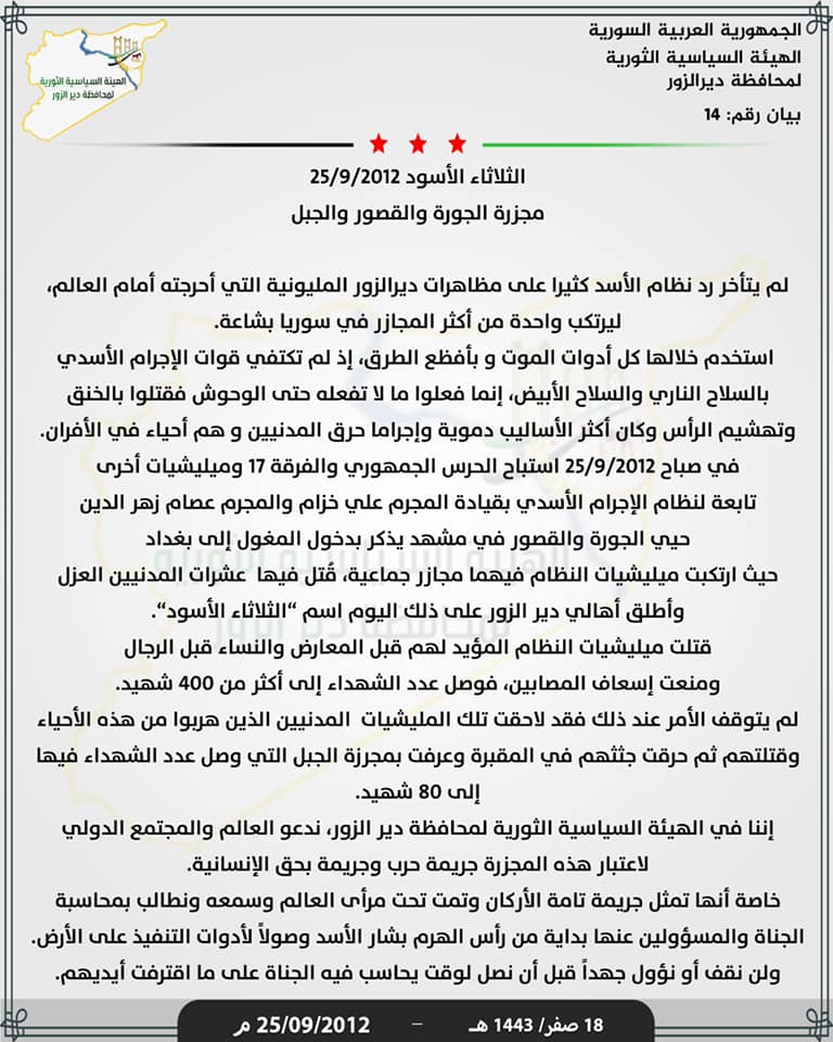 إننا في الهيئة السياسية الثورية لمحافظة ديرالزور، ندعو العالم و المجتمع الدولي لاعتبار هذه المجزرة جريمة حرب و جريمة بحق الإنسانية. خاصة أنها تمثل جريمة تامة الأركان و تمت تحت مرأى العالم و سمعه و نطالب بمحاسبة الجناة والمسؤولين عنها بداية من رأس الهرم بشار الأسد وصولاً لأدوات التنفيذ على الأرض.