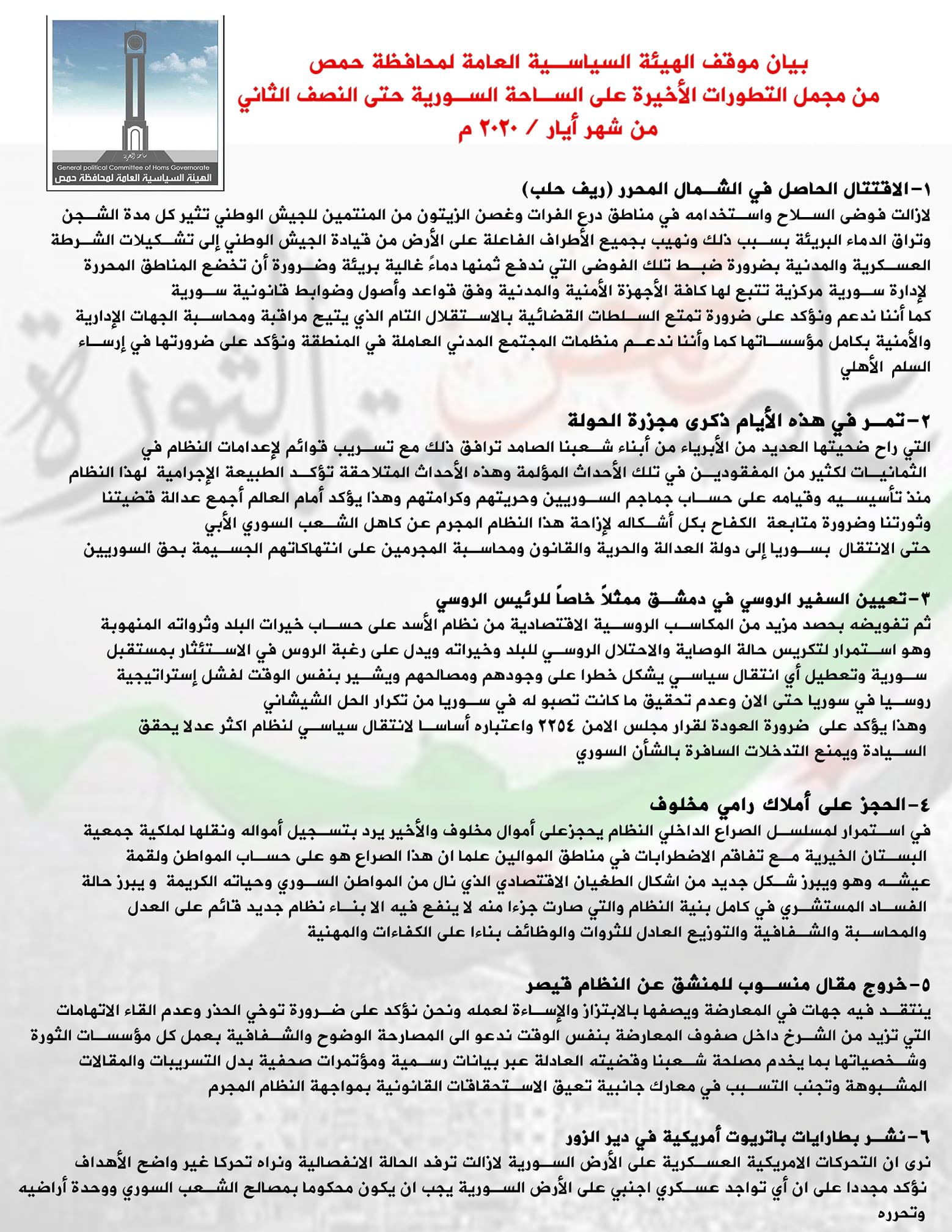 بيان موقف الهيئة السياسية العامة لمحافظة حمص من مجمل التطورات الأخيرة على الساحة السورية حتى النصف الثاني من شهر أيار 2020