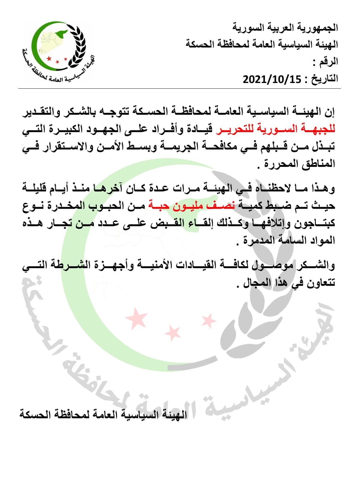 إن الهيئة السياسية العامة لمحافظة الحسكة تتوجه بالشكر والتقدير للجبهة السورية للتحرير قيادة وأفراد على الجهود الكبيرة التي تبذل من قبلهم في مكافحة الجريمة وبسط الأمن والاستقرار في المناطق المحررة .