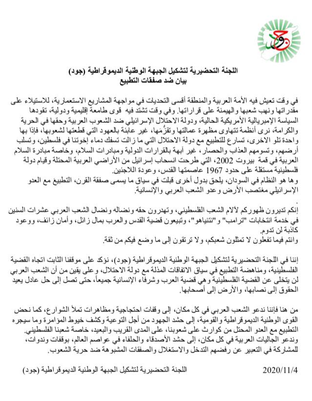 إننا في اللجنة التحضيرية لتشكيل الجبهة الوطنية الديموقراطية (جود)، نؤكد على موقفنا الثابت اتجاه القضية الفلسطينية، ومناهضة التطبيع في سياق الاتفاقات المذلة مع دولة الاحتلال، وعلى يقين من أن الشعب العربي لن يتخلى عن القضية الفلسطينية وهي قضية العرب وشرفاء الإنسانية جميعاً، حتى تصل إلى حل عادل يعيد الحقوق إلى نصابها، والأرض إلى أصحابها.