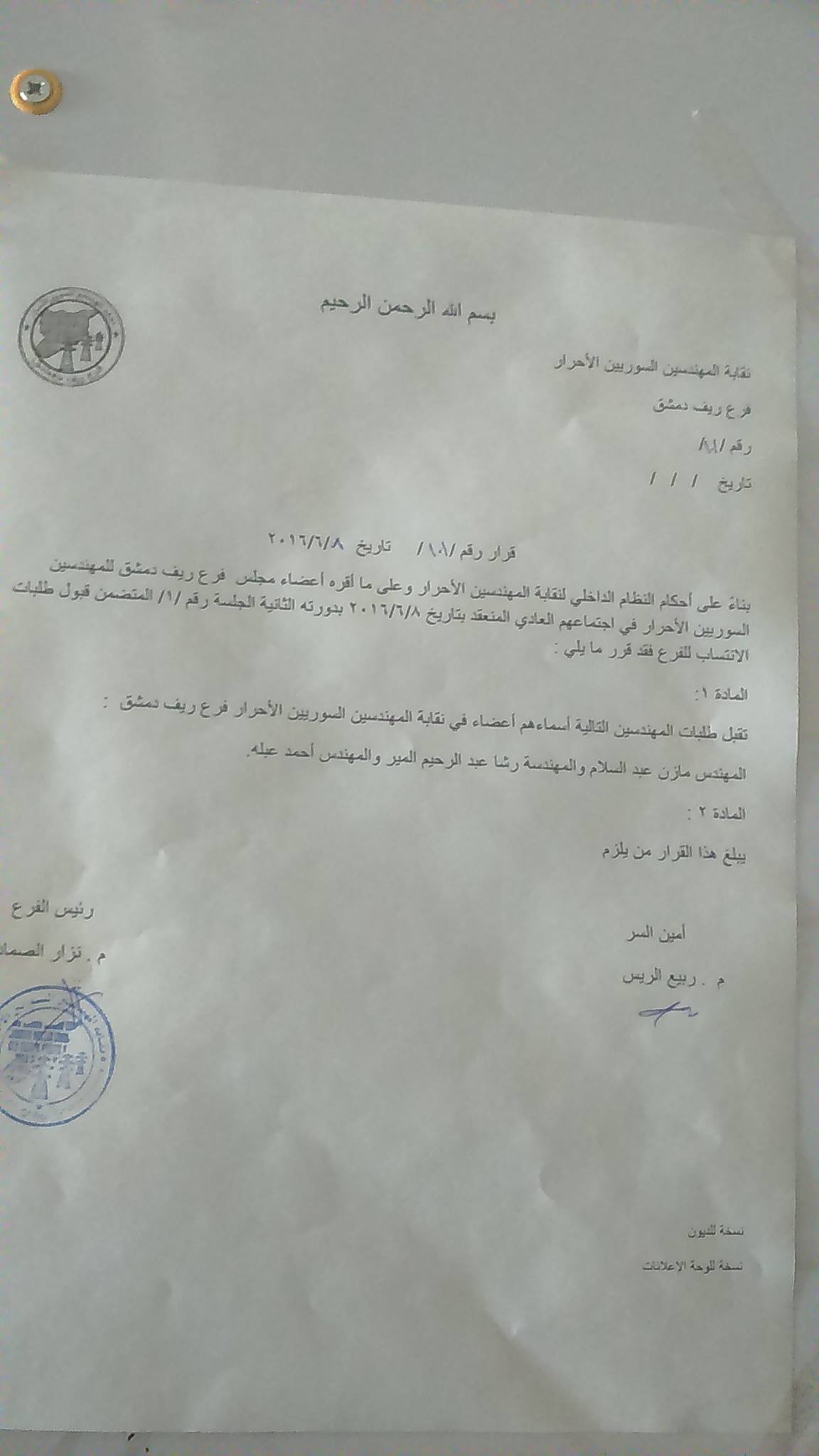 قرار من نقابة المهندسين الأحرار فرع ريف دمشق بقبول عضوية عدد من المهندسين فيها