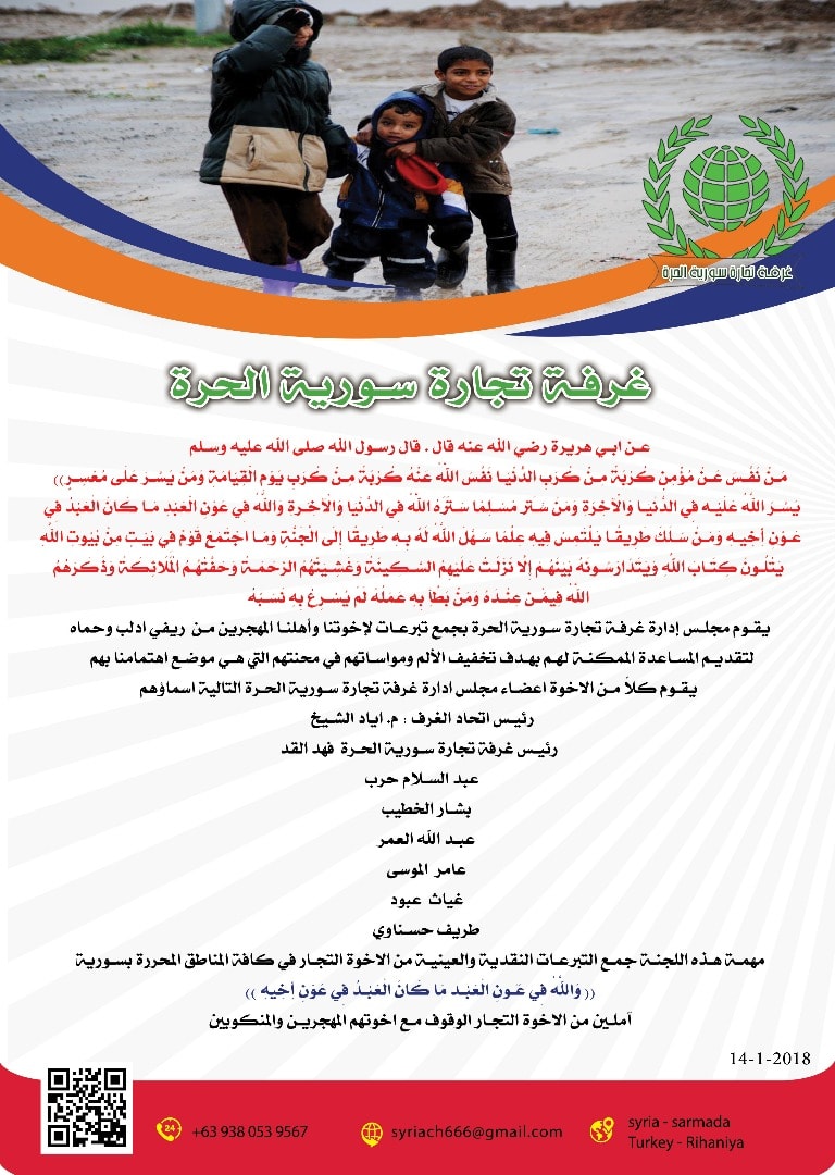 بيان من غرفة تجارة وصناعة سوريا الحرة بخصوص جمع التبرعات للمهجرين من ريفي إدلب وحماة