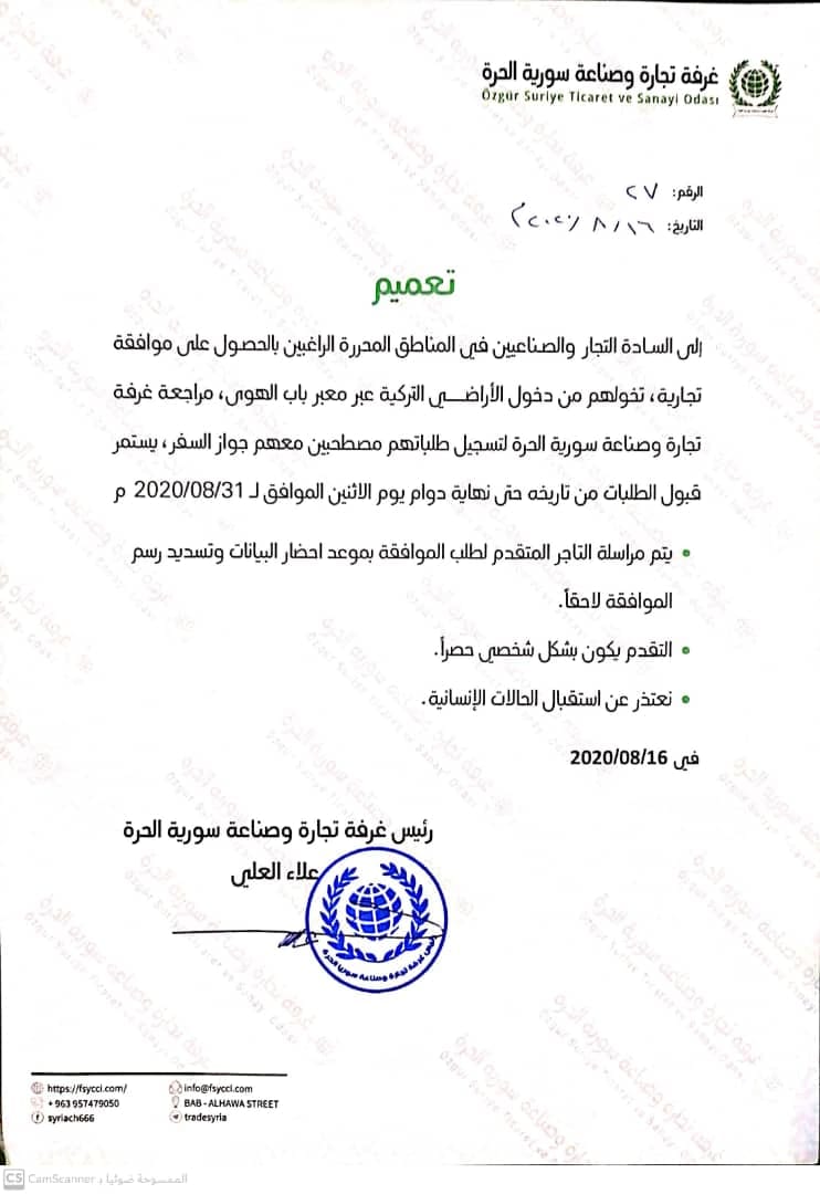 بيان من غرفة تجارة وصناعة سوريا الحرة إلى التجار الراغبين بالحصول على موافقة لدخول الأراضي التركية