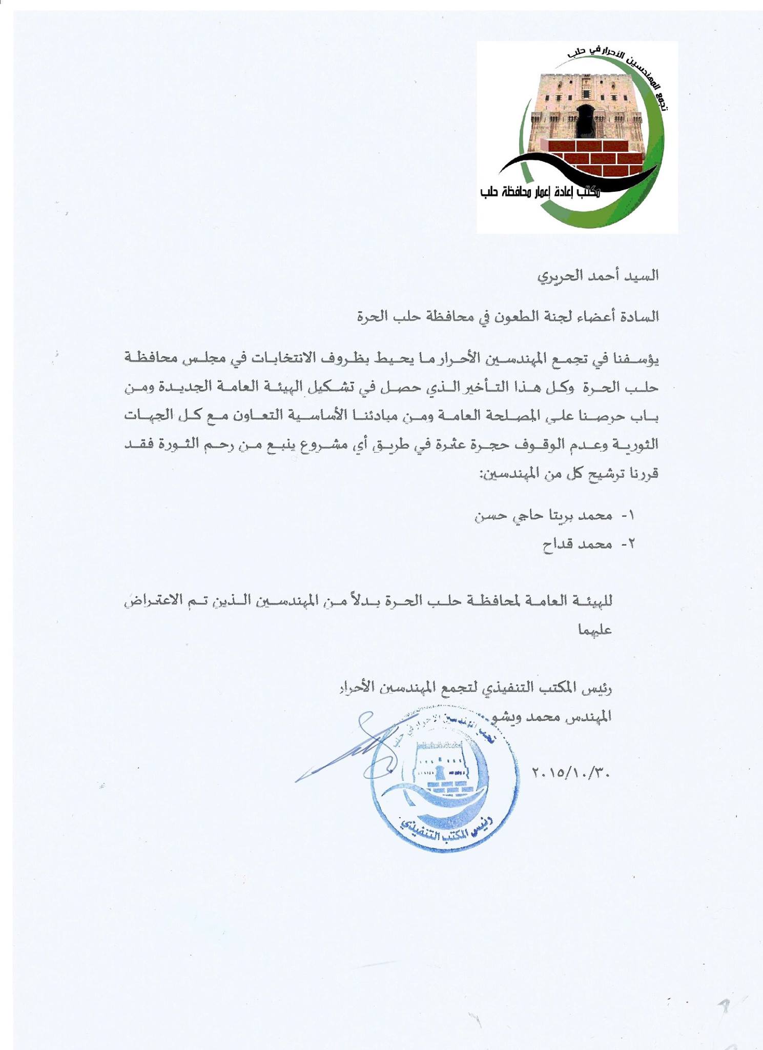 قرار تجمع المهندسين الأحرار في حلب ترشيح أسماء للهيئة العامة لمحافظة حلب الحرة