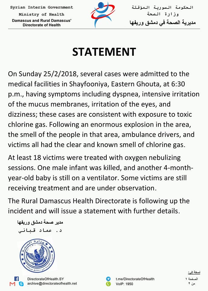 بيان من مديرية الصحة في دمشق وريفها حول استهداف بلدة الشيفونية بالغازات السامة
