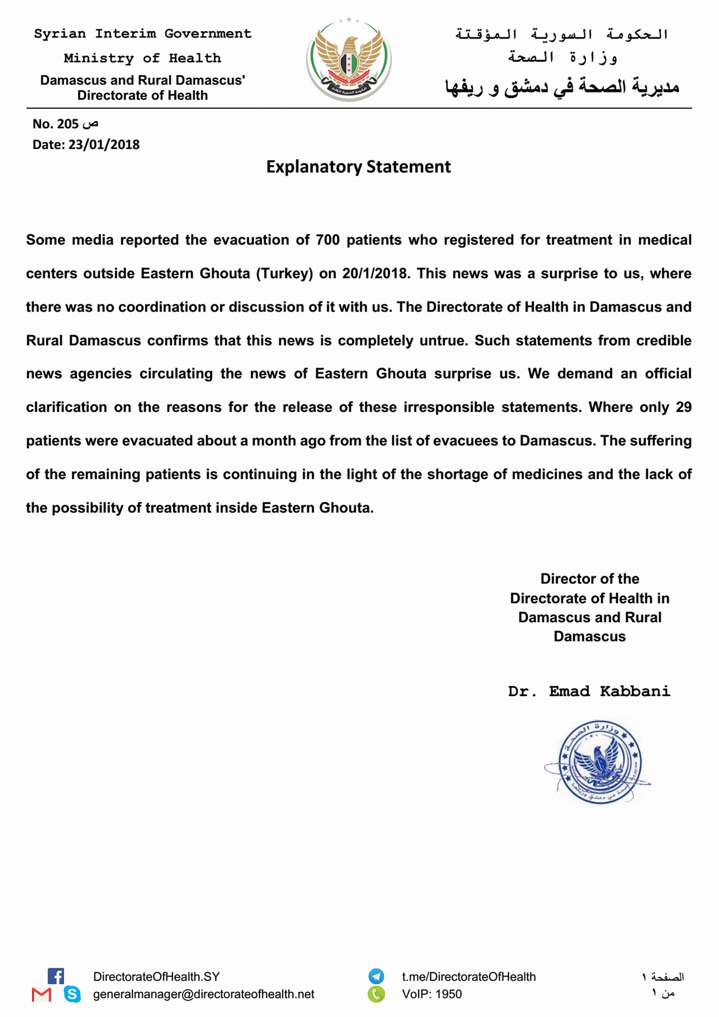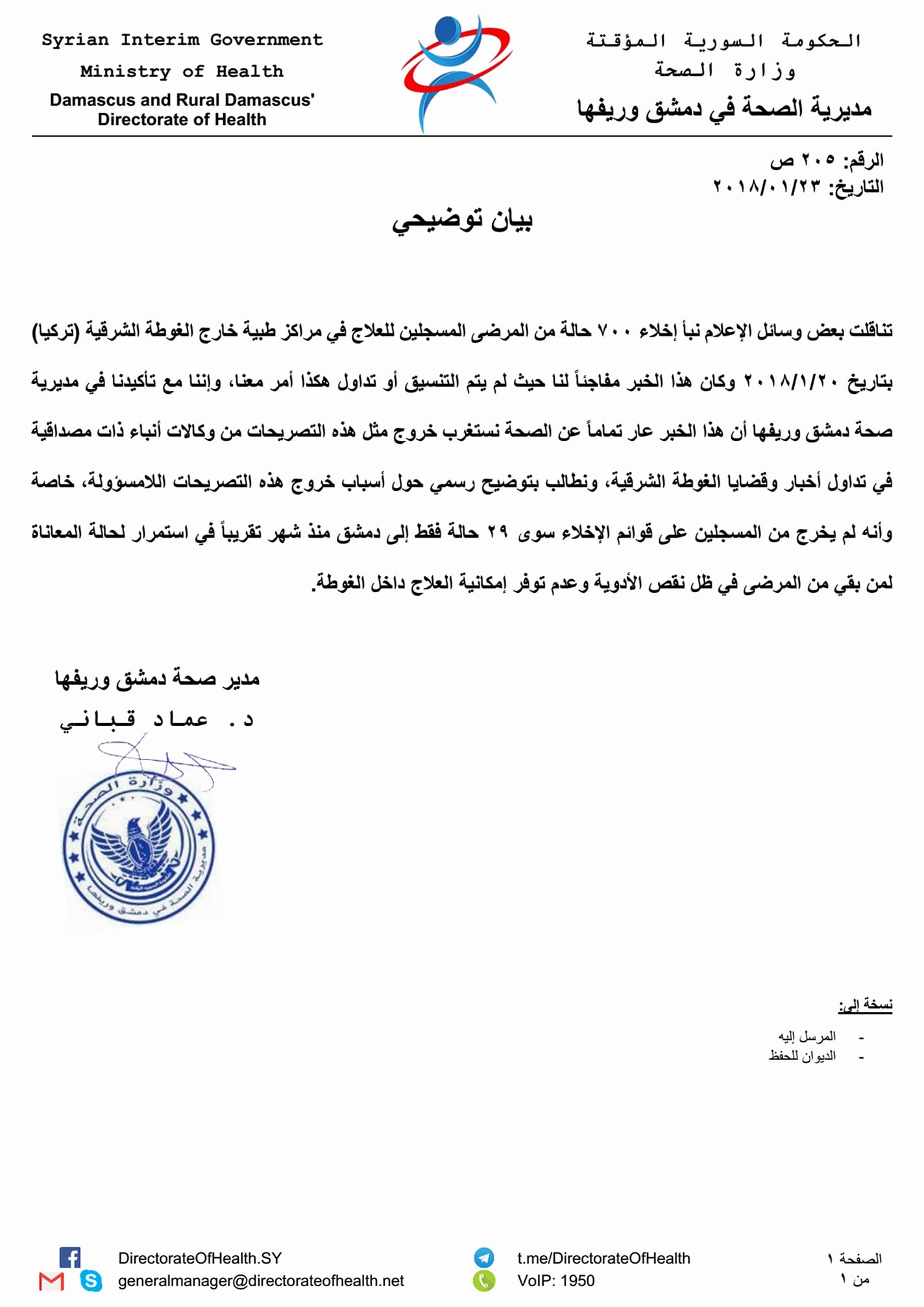 بيان من مديرية الصحة في دمشق وريفها تنفي فيه ما تناقلته بعض وساءل الإعلام حول خروج 700 حالة للعلاج في مشافي تركيا